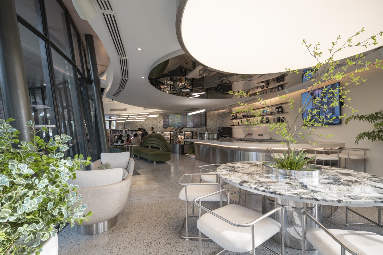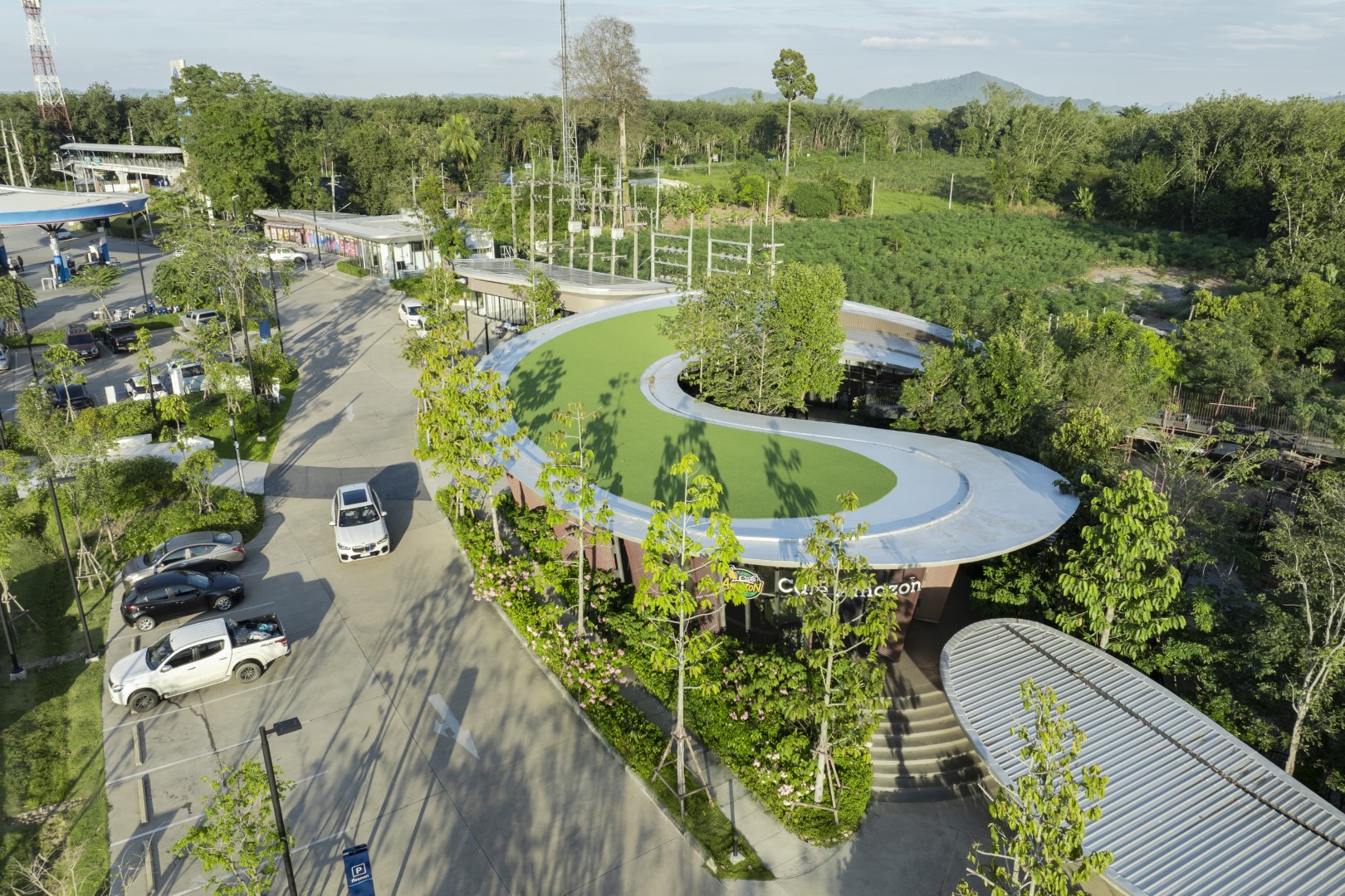 The Amazon concept store features flowing forms with gardens connecting indoor-outdoor zones via the Jungle Trail and rooftop access. Perimeter steel columns eliminate central obstructions, while flat slab concrete roofing achieves thin canopy edges and desired slopes.