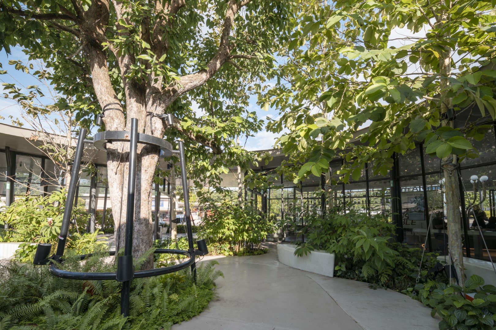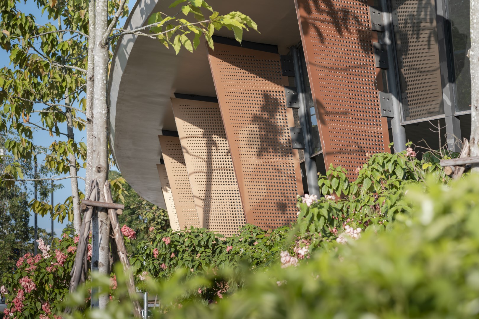 Sun simulation informed walkway canopy design for optimal year-round shade. Two-tier roofing for energy efficiency, standard glazing, and affordable materials in nature-harmonizing colors control costs.