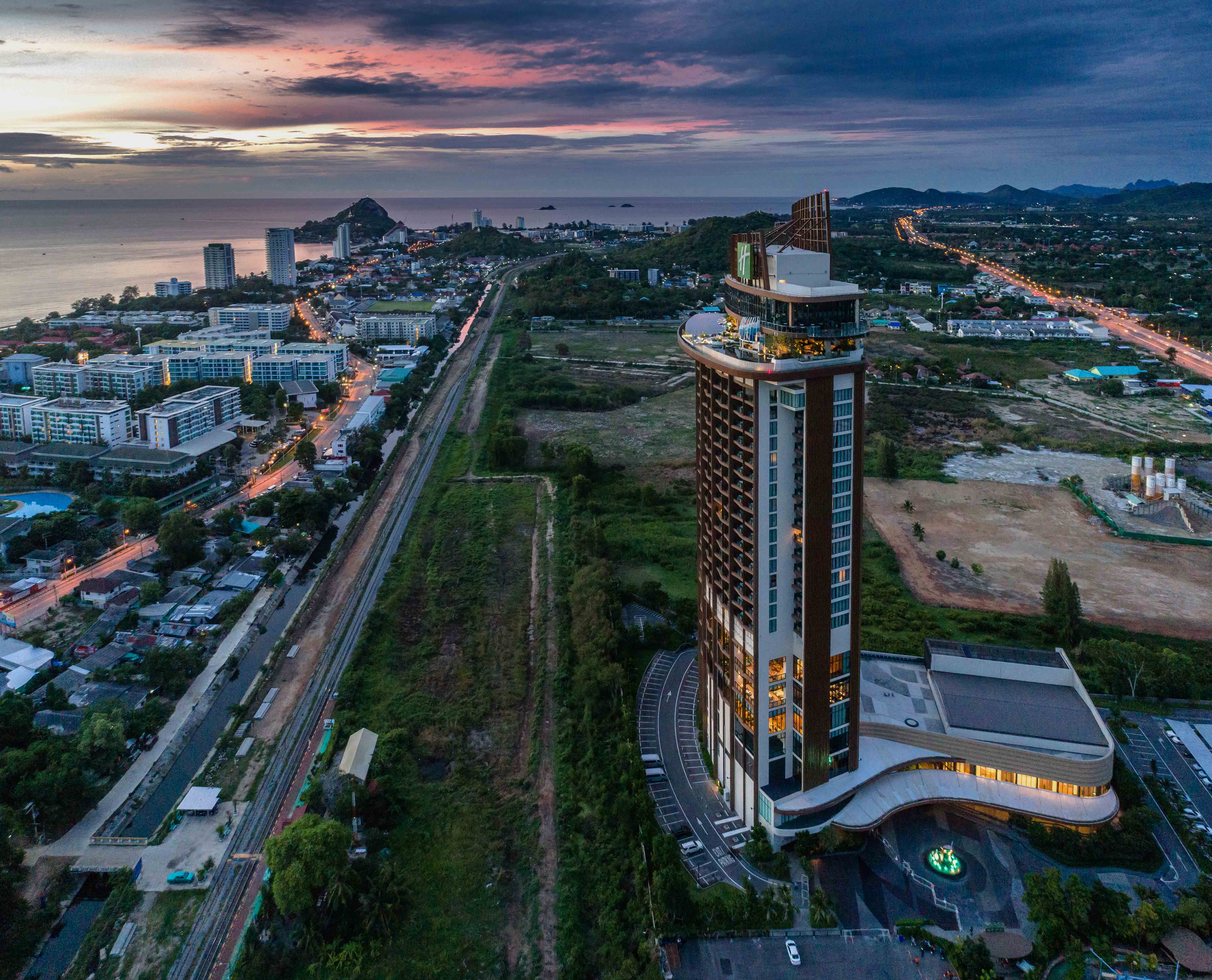 The design concept was to position the common areas to provide optimum views of the ocean and surrounding mountains. A rooftop Infinity Edge pool is the highlight of the building. This is connected to the Sky Bar which has both indoor and outdoor seating was well as a glass-bottomed terrace. 80% of guest rooms have views of the water park, Hua Hin town and the ocean in the distance, all the way down the coast to Kao Tao. Each room boasts a large balcony which is open to the sea breeze.